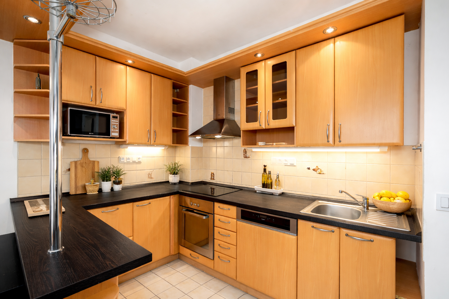 Dominantou bytu je velkorysý obývací pokoj propojený s kuchyní. Kuchyňská linka ve světlém dubu je řešena do tvaru písmene U a doplněna osvětleným barem, který přirozeně odděluje kuchyňskou a obytnou část. Samozřejmostí jsou vestavěné spotřebiče a dostatek pracovního i úložného prostoru.