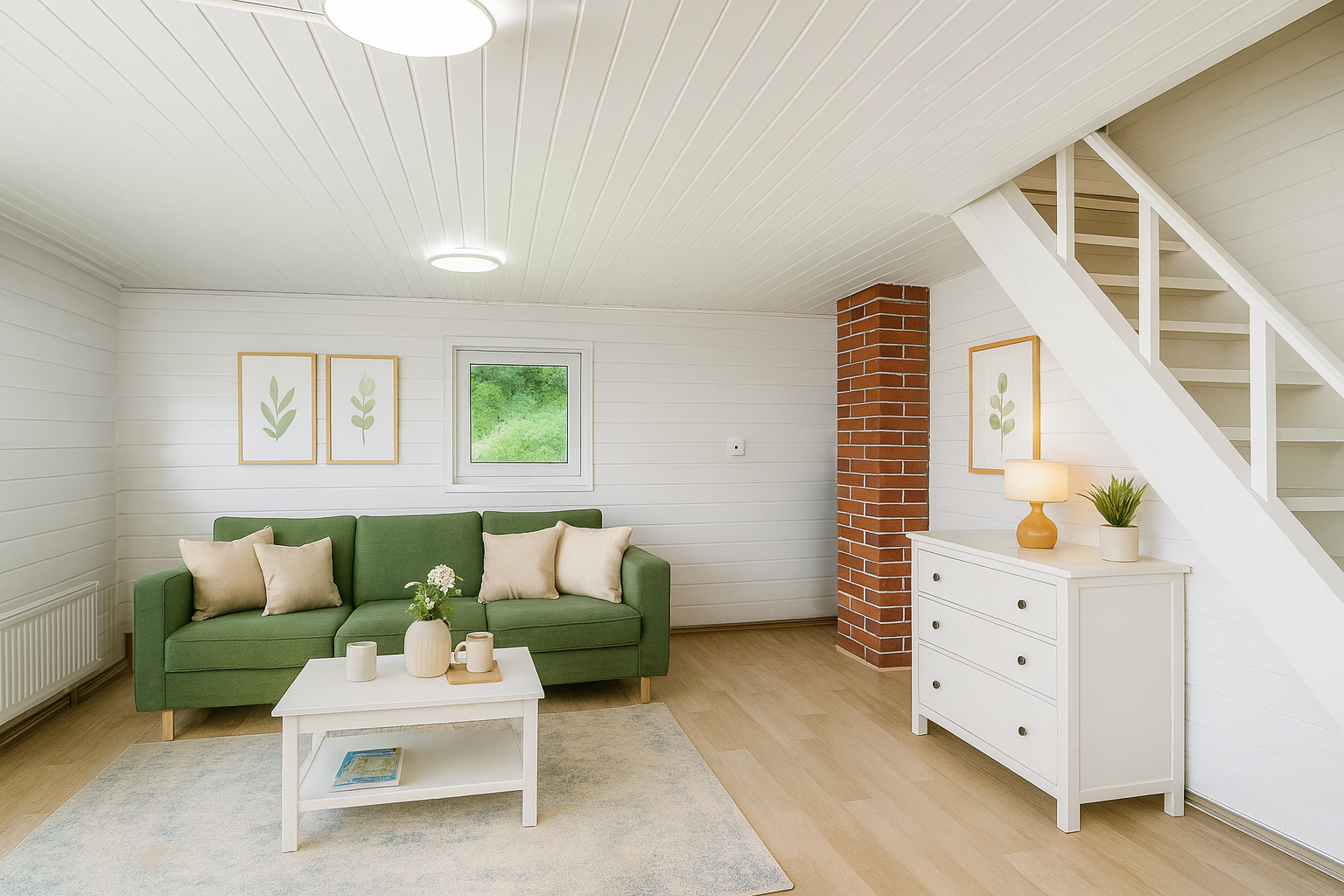 Vše, co vidíte na fotografiích, je skutečný stav po kompletní výmalbě a citlivém doladění v bílo-dřevěném stylu, který dává prostoru lehkost, čistotu a světlost.