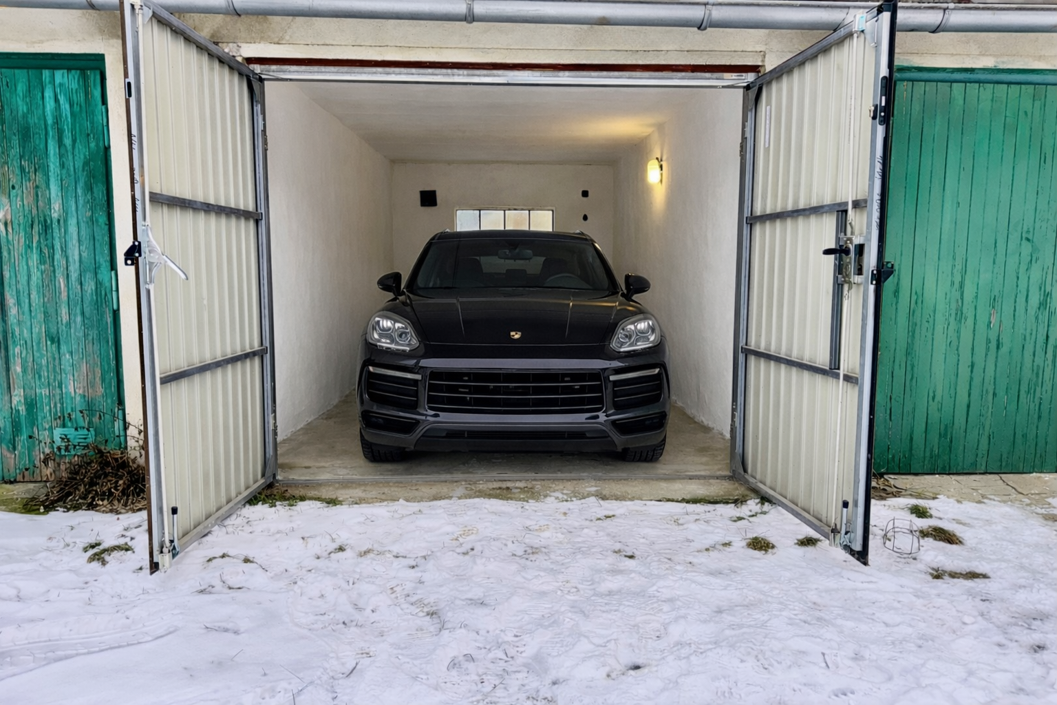 Garáž je vybavena novými kovovými vraty se dvěma bezpečnostními zámky, které zajišťují vysokou míru zabezpečení.